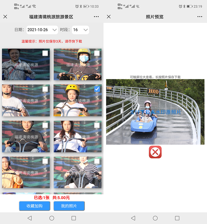 滑板车项目安装了一套自动抓拍系统,游客坐着滑板车从山上一路滑下来,经过抓拍点感应激光传感器触发相机抓拍下来,照片即时自动上传到云端系统,当游客滑到终点下来时,抽出手机扫码关注公众号或已关注过公众号的直接进入下载照片链接,找到自己的照片,看到当时瞬间的精彩照片,挺开心的,下载下来作留念,和发一下朋友圈与亲朋好友分享。