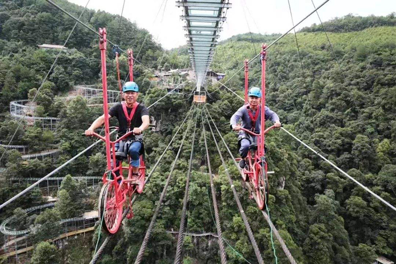 空中自行车是一项具有一定惊险刺激、探险的游乐项目,主要借助索道上的人骑单车的速度拉动你滑行,可以跨越草地、湖泊、河流、峡谷,张开双臂耳边呼吸的风声笼罩全身,体会着刹那间的自由,充分享受其中的刺激和无穷的乐趣。游客进行在距地面几十米甚至上百米高的架空钢丝绳上,满园美景尽收眼底,可根据自己兴致爱好时快时慢地畅游其中。